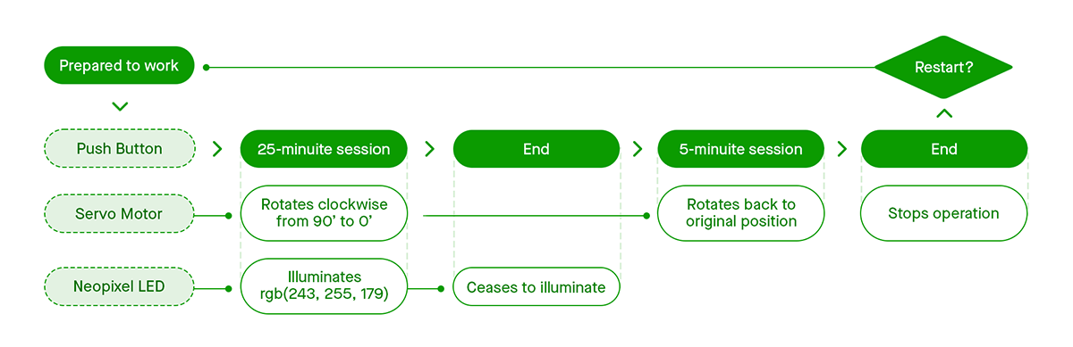 It features a Pomodoro timer with a unique, single lighting mode to help you manage work and break times effectively. During a 25-minute work session, a gentle light illuminates the space while a sphere gradually descends, subtly indicating the remaining time. When the 5-minute break begins, the light turns off and the sphere ascends back to its original position.