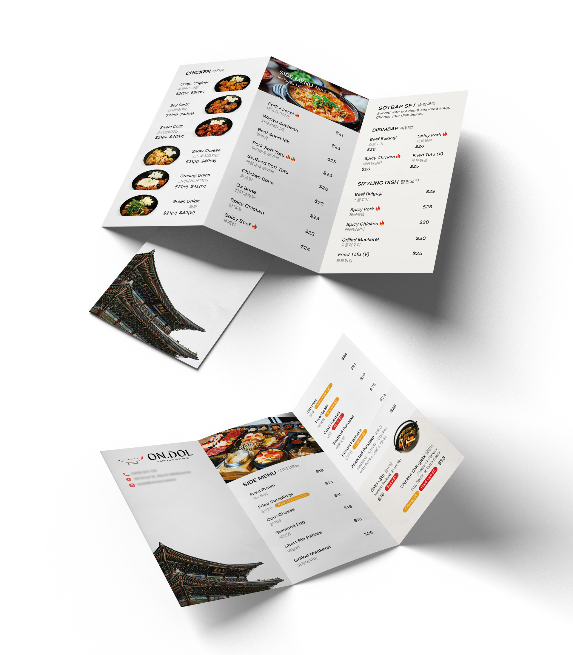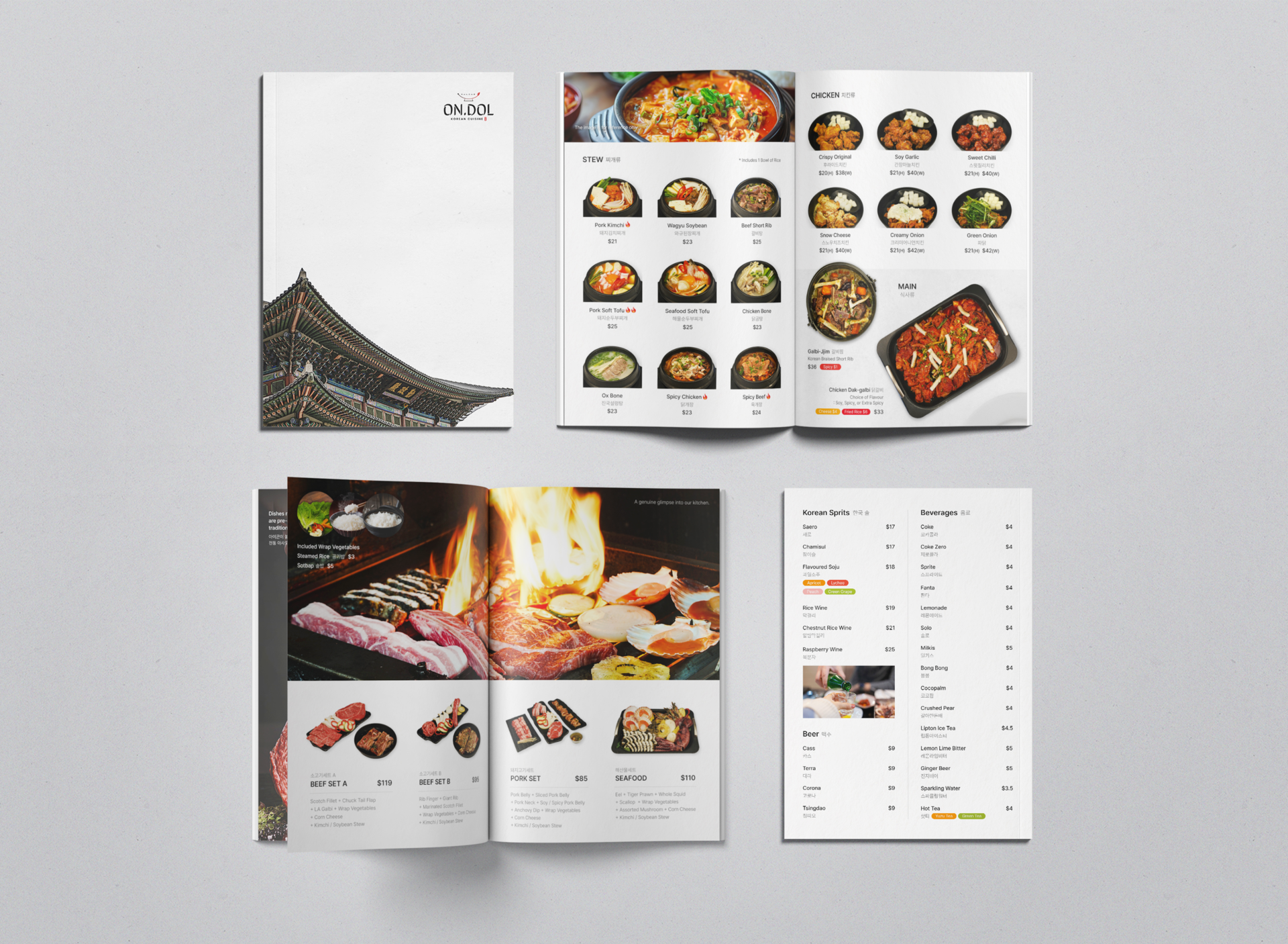 Menu series designed and photographed for Ondol Korean Restaurant in Melbourne, Australia, presented in two formats: an A4 saddle-stitched booklet