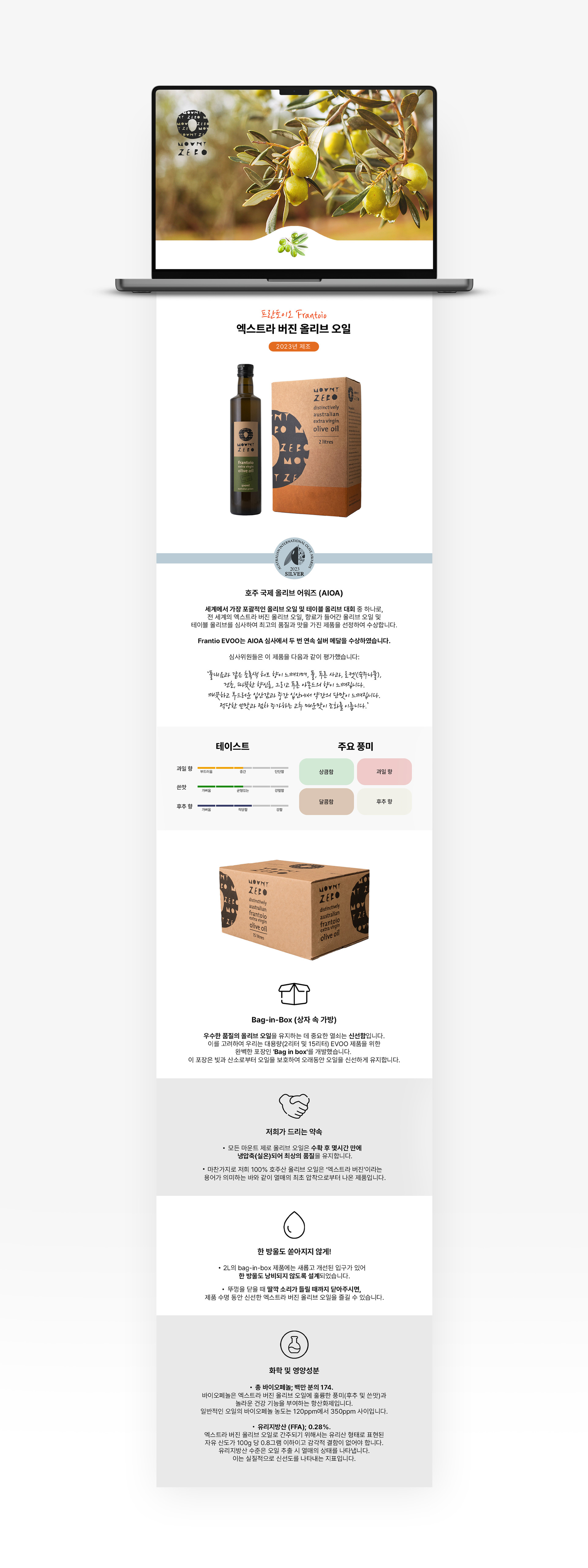 Commissioned by a distributor, this project involved creating a Korean product detail page for the Australian brand Mount Zero Olive Oil. Since the series included several similar pages, only one representative design is displayed.